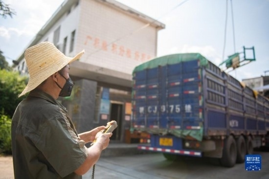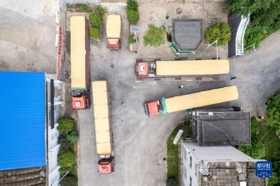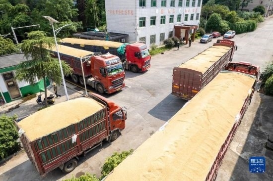 8月7日,運(yùn)糧車在湖南安仁國(guó)家糧食儲(chǔ)備庫(kù)排隊(duì)過磅(無人機(jī)照片)。