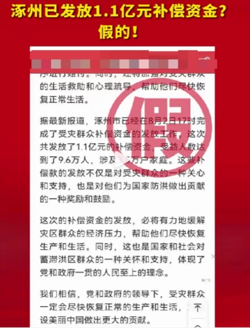 近日,網(wǎng)傳消息稱“河北省涿州市已經(jīng)在8月2日完成了1.1億受災群眾補償資金的發(fā)放工作,受益人數(shù)達到了9.6萬人,涉及3.5萬戶家庭”。