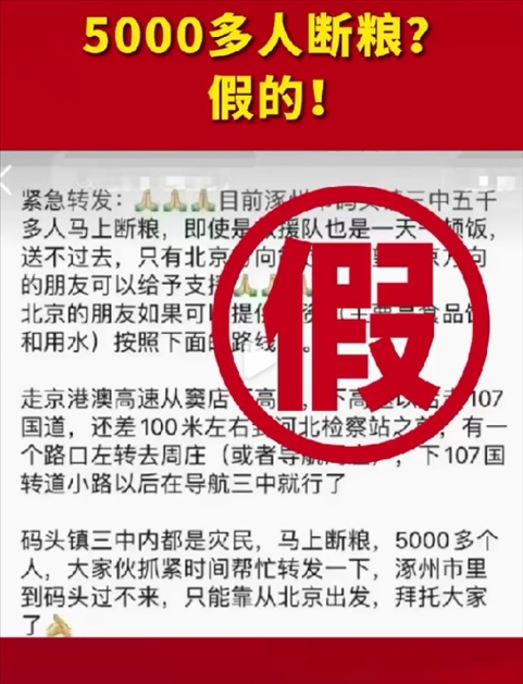 近日,網(wǎng)傳“河北省涿州市碼頭鎮(zhèn)5000多人將斷糧,救援隊也是一天只吃一頓飯,送不過去”消息,引發(fā)了眾多網(wǎng)民關注。