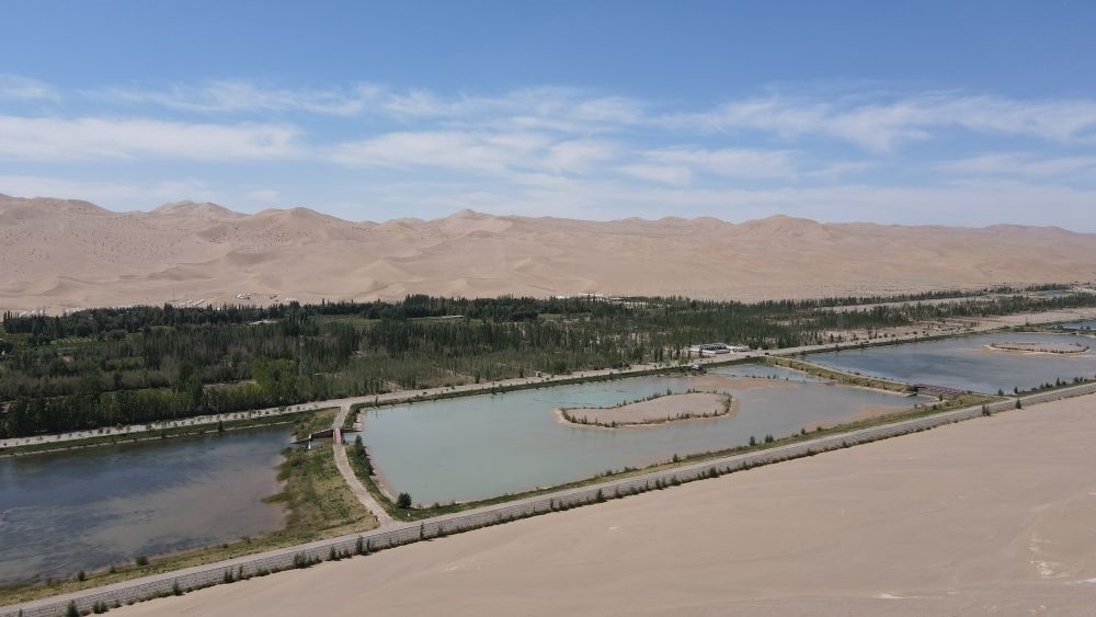 在距離月牙泉5公里的地方,有一處人稱(chēng)“十二連湖”的景觀。十二個(gè)人工水池宛若明鏡,倒映藍(lán)天,時(shí)有水鳥(niǎo)掠過(guò)。