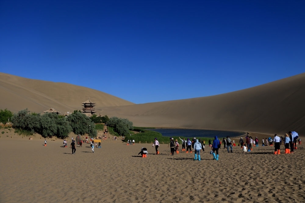 從敦煌市區(qū)出發(fā),向南行走5公里,就到了鳴沙山下。起伏黃沙勾勒出一道道利落的曲線(xiàn),三面沙山環(huán)抱,突現(xiàn)一泓月牙形狀的清泉,水波蕩漾,魚(yú)翔淺底。