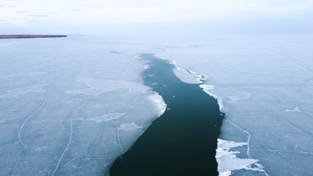 這是4月17日拍攝的呼倫湖開(kāi)湖景象(無(wú)人機(jī)照片)。新華社記者 王楷焱 攝