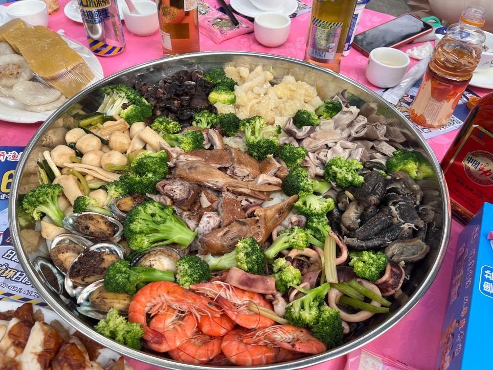 開漁宴上鋪滿海鮮的漁家大盤菜。(陽(yáng)江廣播電視臺(tái)供圖)