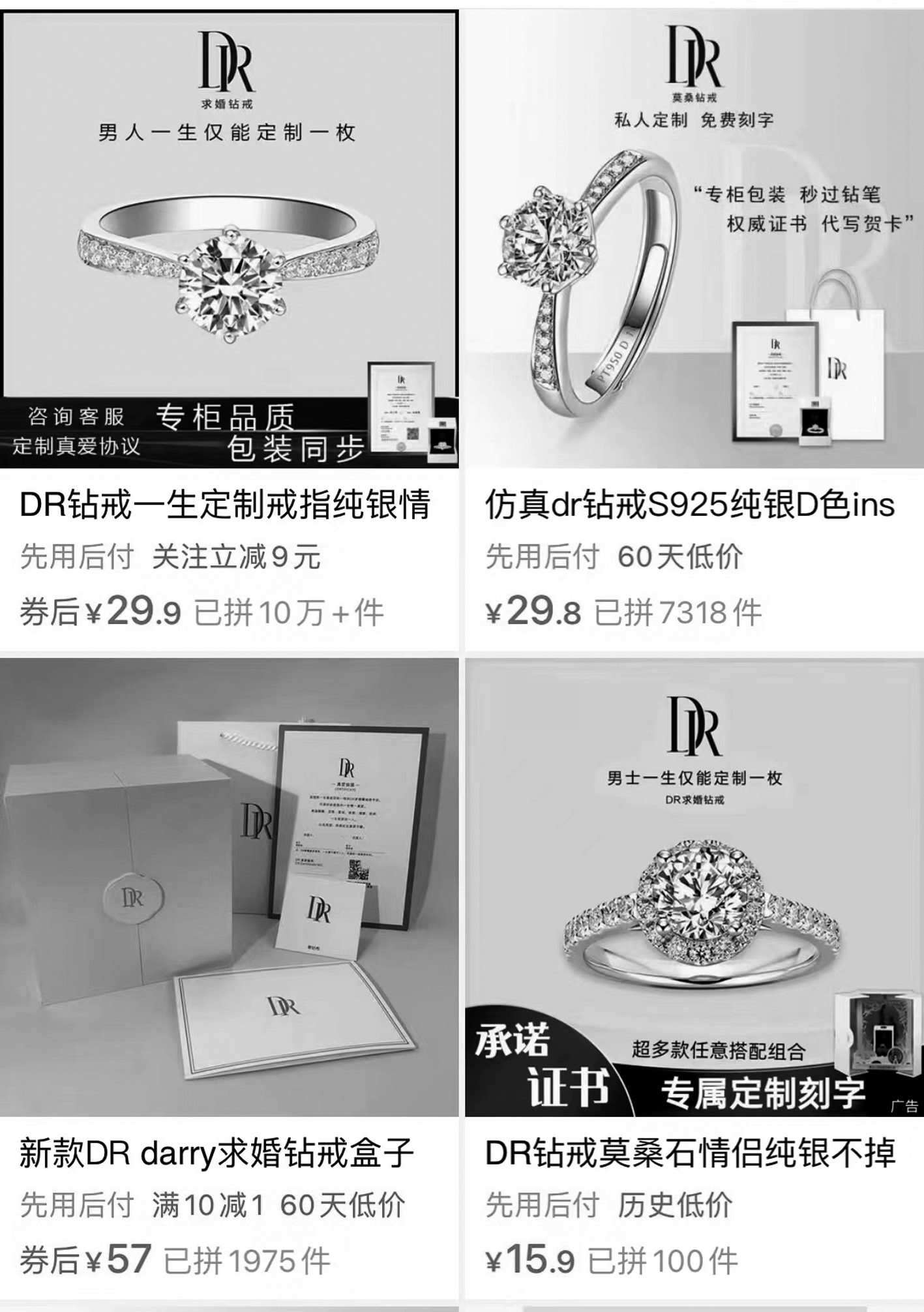 記者在一家電商平臺輸入“DR鉆戒”,映入眼簾的商品售價只要幾十塊,幾乎都把“男士一生僅能定制一枚”作為賣點(diǎn)。還有商家寫道,“專柜品質(zhì)、包裝同步”“咨詢客服定制真愛協(xié)議”。