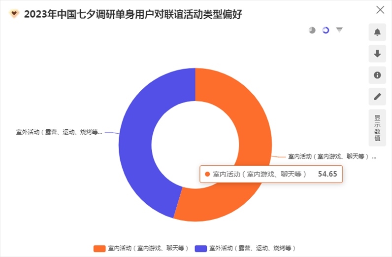 “單身經(jīng)濟(jì)與浪漫經(jīng)濟(jì)并不沖突?!睆堃愀嬖V記者,今年單身人士參加七夕節(jié)交友聯(lián)誼活動意愿強(qiáng)烈,“有53.77%的表示會參加。在聯(lián)誼活動的選擇上,54.65%的人會選擇劇本殺、密室逃脫、桌游等室內(nèi)活動。”