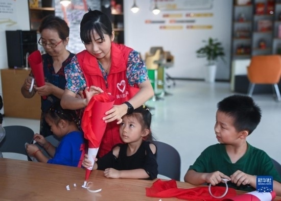 8月24日,在湖州市龍泉街道白魚潭社區(qū)新時代文明實踐站,黨員志愿者教孩子們制作手工火炬。