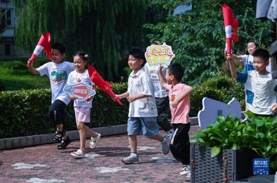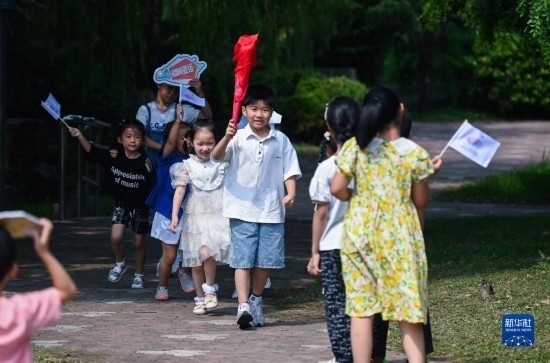 8月24日,在湖州市龍泉街道白魚潭社區(qū),孩子們拿著自己制作的火炬,參與趣味火炬?zhèn)鬟f活動。