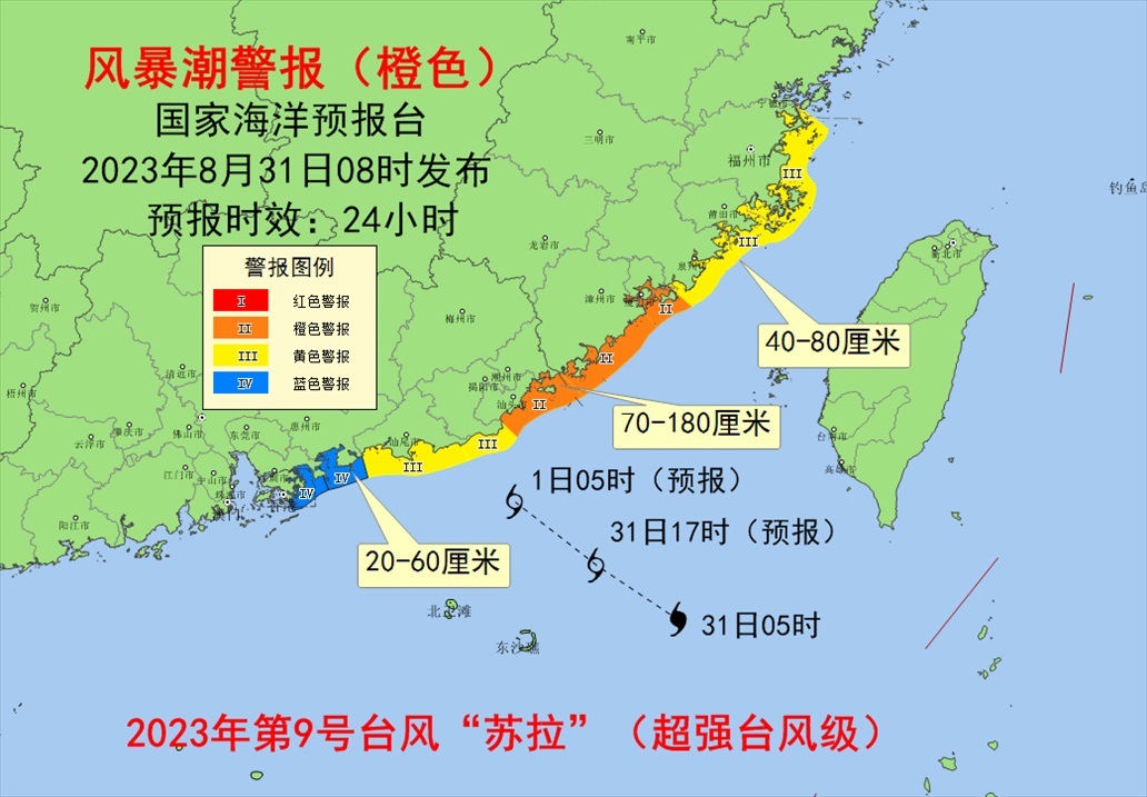 預(yù)計(jì)8月31日上午至9月1日中午,福建福州至泉州沿海將出現(xiàn)40到80厘米的風(fēng)暴增水,福建廈門(mén)至廣東汕尾沿海將出現(xiàn)70到180厘米的風(fēng)暴增水,廣東惠州和深圳沿海將出現(xiàn)20到60厘米的風(fēng)暴增水。福建省廈門(mén)市、漳州市、廣東省潮州市和汕頭市的風(fēng)暴潮預(yù)警級(jí)別為橙色,福建省福州市、莆田市、泉州市、廣東省揭陽(yáng)市和汕尾市的風(fēng)暴潮預(yù)警級(jí)別為黃色。