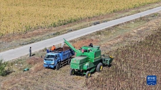 10月1日,在沽源縣白土窯鄉(xiāng)小西溝村,當(dāng)?shù)剞r(nóng)機(jī)手將藜麥裝車裝備外運(yùn)(無(wú)人機(jī)照片)。