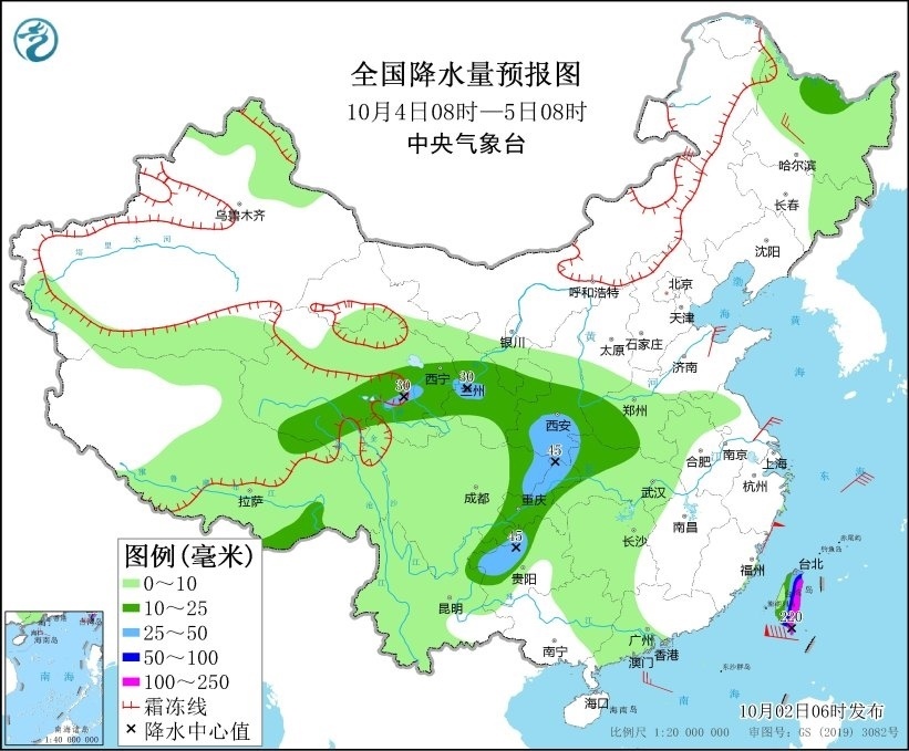 10月3日08時至4日08時,黑龍江西南部、遼寧東部、西藏東南部、青海東部、甘肅東南部、陜西中南部、重慶北部以及臺灣島北部等地部分地區(qū)有中到大雨,其中,臺灣島北部和東部等地部分地區(qū)有暴雨(50~95毫米)。內(nèi)蒙古東南部、西藏北部等地部分地區(qū)有4~6級風(fēng)。渤海、渤海海峽、黃海大部、東海北部將有6~7級風(fēng)、陣風(fēng)8級,東海西南部海域風(fēng)力將有7~8級風(fēng)、陣風(fēng)9級。臺灣以東洋面將有7~8級轉(zhuǎn)9~10級風(fēng)、陣風(fēng)9級轉(zhuǎn)11級(見圖2)。