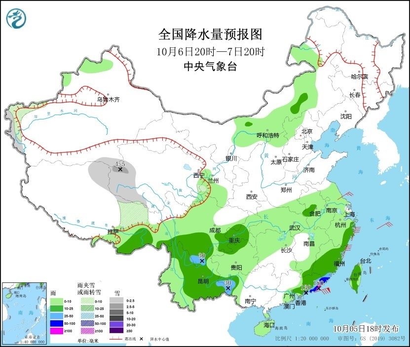 10月5日20時(shí)至6日20時(shí),西藏東北部、青海中南部和東北部、甘肅西北部等地部分地區(qū)有小到中雪或雨夾雪,青海西北部局地有大雪;西藏東南部、陜西南部、四川盆地東部、重慶、貴州西部、云南東北部、湖北西部、廣東東部沿海、福建南部及臺(tái)灣島南部等地部分地區(qū)有中到大雨,其中,西藏東南部、臺(tái)灣島南部等地部分地區(qū)有暴雨(50~75毫米)。西藏西部、四川盆地中部等地有5~6級(jí)風(fēng)、陣風(fēng)7級(jí),浙江沿海、福建沿海、廣東東部沿海、臺(tái)灣島西北部沿海等地有6~8級(jí)風(fēng)、陣風(fēng)9級(jí)(見(jiàn)圖1)。