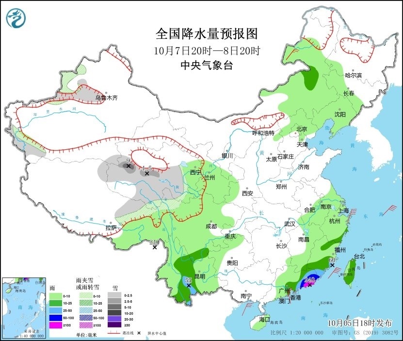 10月7日20時(shí)至8日20時(shí),青海中南部、西藏東北部、新疆西部等地部分地區(qū)有小雪或雨夾雪,青海中部局地有中到大雪;四川南部、云南中部、浙江南部、福建南部、廣東東部、臺(tái)灣島等地部分地區(qū)有中到大雨,其中廣東東部、福建南部、云南南部等地部分地區(qū)有暴雨,廣東東部沿海地區(qū)局地有大暴雨(100~240毫米)。浙江、福建和廣東沿海等地有4~6級(jí)風(fēng)、陣風(fēng)7級(jí);東海西南部及中部海域、臺(tái)灣海峽、南海東北部偏北海域有6~7級(jí)風(fēng)、陣風(fēng)8~9級(jí)(見(jiàn)圖3)。