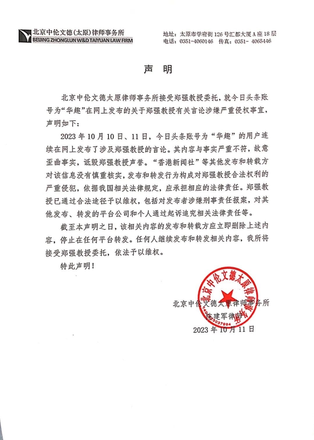 同時,北京中倫文德太原律師事務(wù)所接受鄭強(qiáng)教授委托發(fā)表聲明,稱將依法予以維權(quán)。