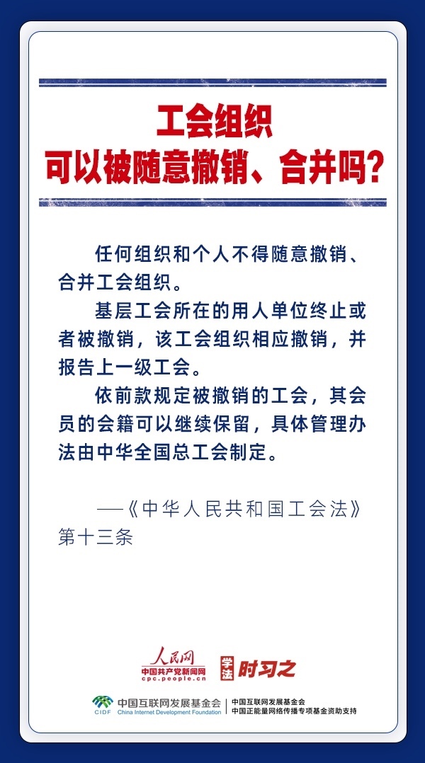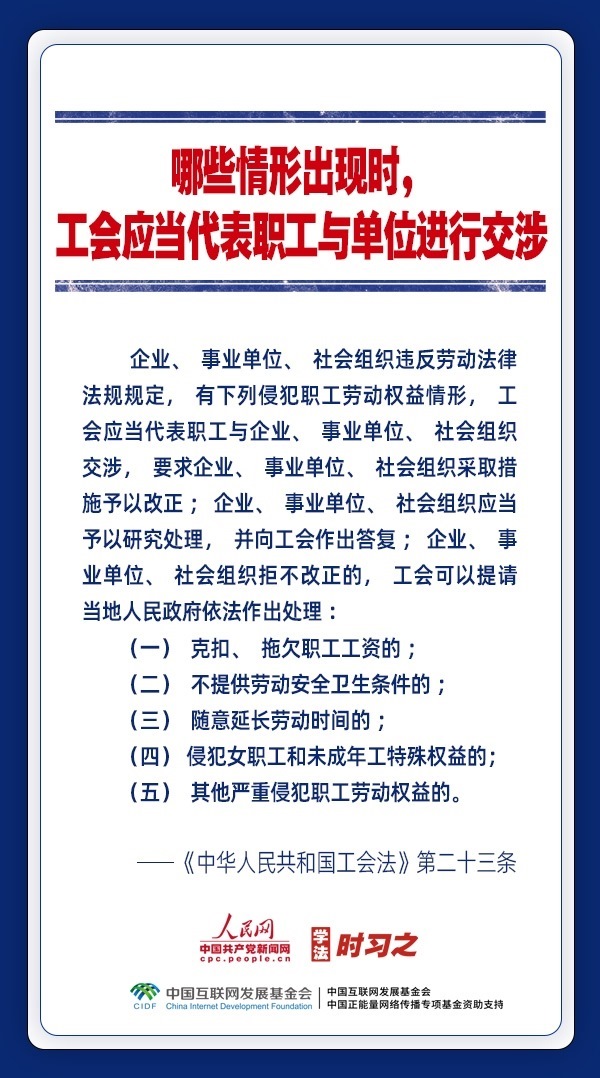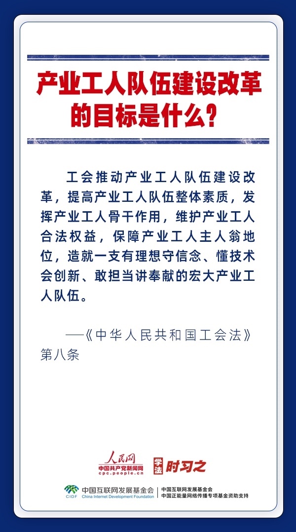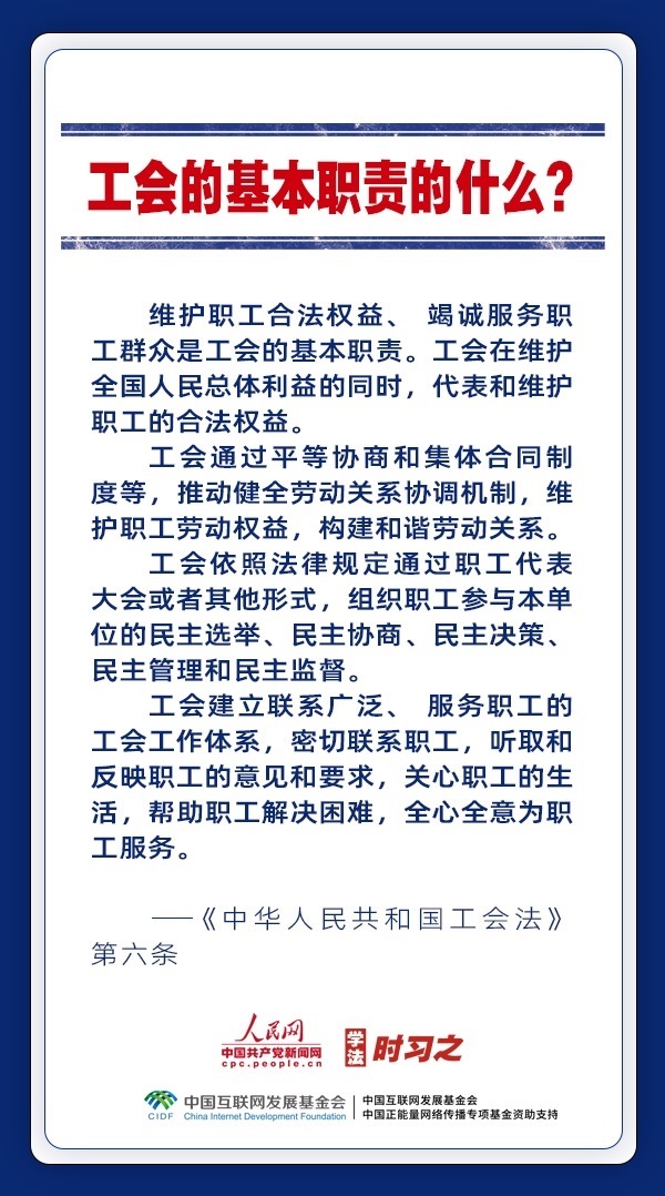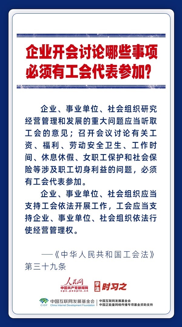 日前,中華全國(guó)總工會(huì)新一屆領(lǐng)導(dǎo)班子產(chǎn)生。黨和政府歷來(lái)重視工會(huì)的地位作用,十分注重加強(qiáng)工會(huì)法律制度建設(shè),專門(mén)為廣大職工制定了《中華人民共和國(guó)工會(huì)法》。網(wǎng)約車(chē)司機(jī)、快遞員、外賣(mài)配送員能入工會(huì)嗎?產(chǎn)業(yè)工人隊(duì)伍建設(shè)改革的目標(biāo)是什么?企業(yè)開(kāi)會(huì)討論哪些事項(xiàng)必須有工會(huì)代表參加?一起來(lái)了解。
