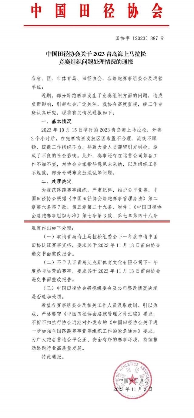 央視網消息:據“中國馬拉松平臺”官微消息,近日,部分路跑賽事出現了一些競賽組織問題,引發(fā)社會廣泛關注,造成了不良的社會影響。中國田徑協會高度重視、全面調查,依據事實和路跑賽事管理規(guī)定,從加強競賽組織,壓實各方主體責任,提示行業(yè)風險隱患的角度,對相關單位和人員進行了相應處理?,F將處理情況通報如下: