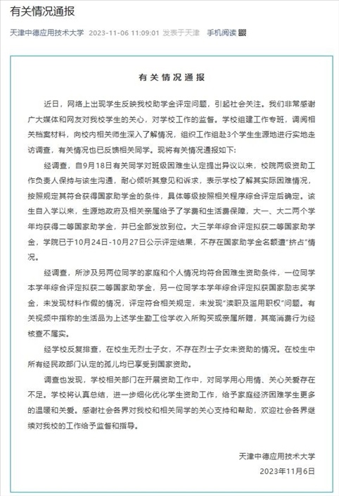 ·天津中德應(yīng)用技術(shù)大學(xué)通報(bào)助學(xué)金事件調(diào)查結(jié)果:不存在國家助學(xué)金名額遭“擠占”情況。