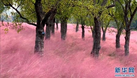 近日,在安徽省阜陽市泉河濕地景觀帶,大片粉黛亂子草進(jìn)入最佳觀賞期。粉色的花海如云似霧,夢幻唯美。