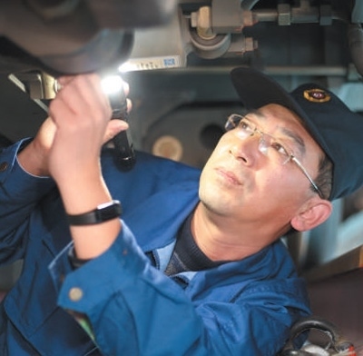 時(shí)而膝蓋微弓,腰部略彎;時(shí)而敲敲打打,上前細(xì)嗅……只見劉波進(jìn)車廂、鉆車底、登車頂,對列車逐一進(jìn)行檢查,不一會(huì)兒,動(dòng)車隱患就被及時(shí)發(fā)現(xiàn)并排除。