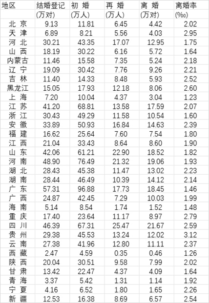 表:2022年31個(gè)省份結(jié)婚登記、初婚、再婚、離婚及離婚率數(shù)據(jù)(數(shù)據(jù)來(lái)源:《中國(guó)統(tǒng)計(jì)年鑒2023》)