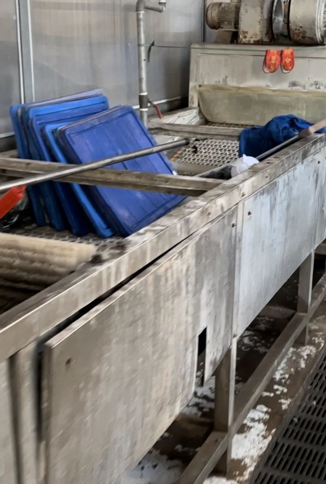 進入廠房首先看到的就是一整車餐余垃圾,靠墻放置著多箱已使用后的餐具,地面上存有積水,機器處于停止狀態(tài),工作臺上留有殘余垃圾,還有鞋墊在上面晾曬。在此期間有多輛小型貨車來裝卸餐具。