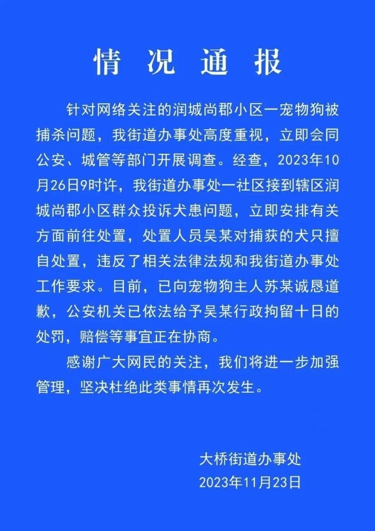 ·安徽安慶通報(bào)“寵物犬被捕狗隊(duì)抓走后送往市場(chǎng)宰殺”:處置人員被行拘10日。