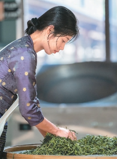 在景邁山布朗公主茶廠,一名傣族姑娘給茶葉殺青。