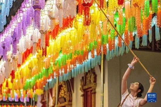11月23日,游客在泰國南奔府哈利奔猜寺懸掛燈籠。