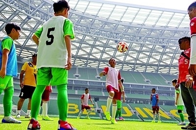 來自青海玉樹的40名藏族青少年參加“青海玉樹藏族青少年北京行”公益活動(dòng),與國安少年足球隊(duì)交流。新華社發(fā)