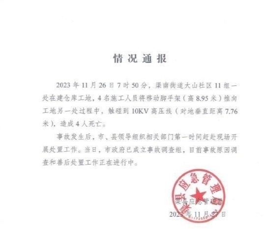 ·四川達州發(fā)生觸電安全事件造成4人死亡,當(dāng)?shù)貞?yīng)急管理局通報:4名工人移動腳手架碰高壓線身亡。