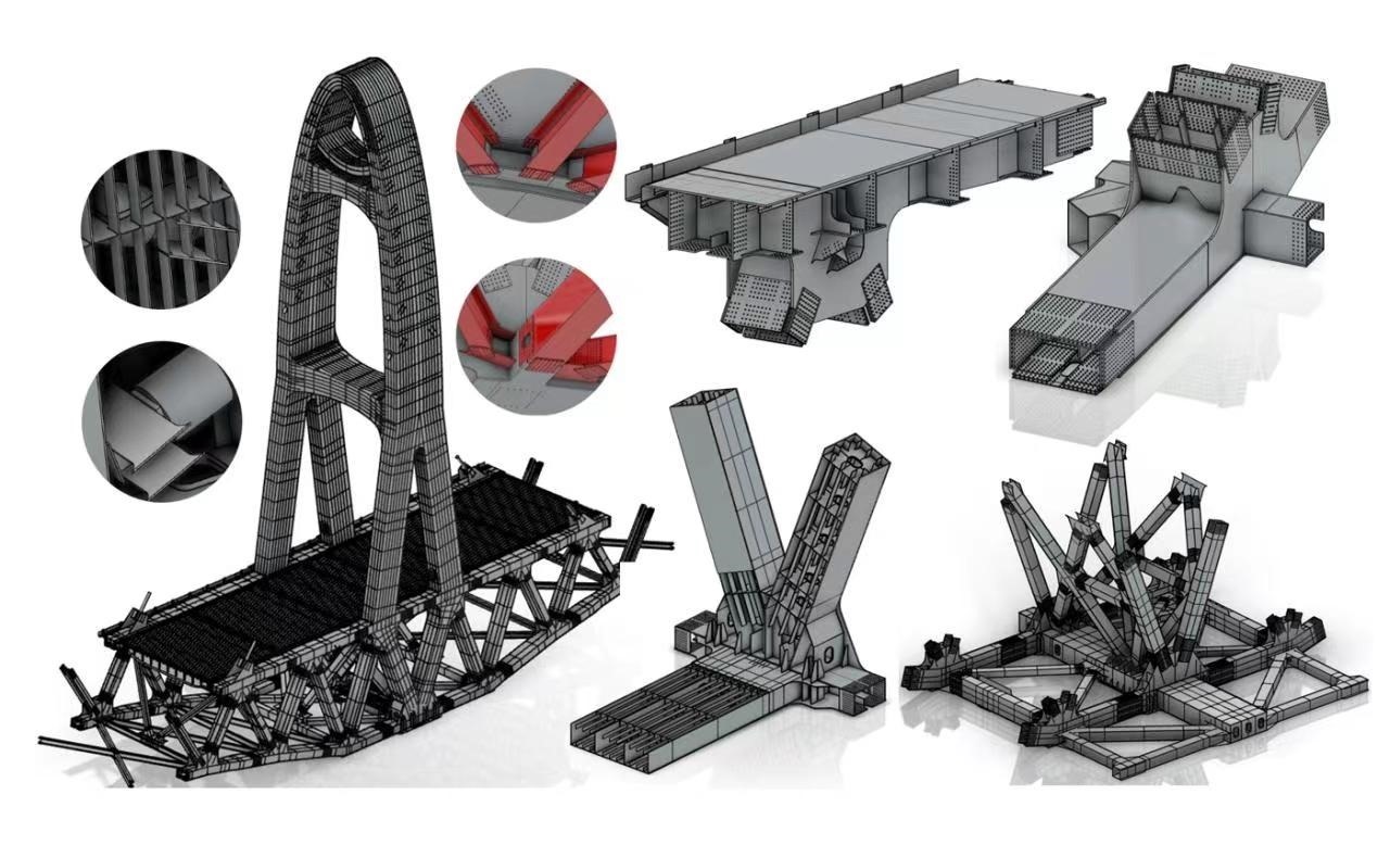 “本橋曲線鋼桁梁構(gòu)造異常復(fù)雜,鋼塔外形為半橢圓變截面,桁架近萬根桿件空間定位要求嚴(yán)絲合縫。為了準(zhǔn)確表達(dá)每個(gè)細(xì)節(jié),我們采用了BIM正向設(shè)計(jì)思路,探索出設(shè)計(jì)—建模—成圖一體化的設(shè)計(jì)流程,開發(fā)出自動化建模功能和智能化出圖系統(tǒng),為施工企業(yè)和鋼梁制造廠提供高精度的模型和批量圖紙,精準(zhǔn)表達(dá)復(fù)雜的結(jié)構(gòu)信息和設(shè)計(jì)意圖,打通了設(shè)計(jì)—制造—施工全過程信息傳遞路徑,有效節(jié)約了工期與造價(jià)?!敝需F設(shè)計(jì)集團(tuán)大橋項(xiàng)目主管總工彭嵐平向我們講述了大橋采用的最新智能化設(shè)計(jì)手段。
