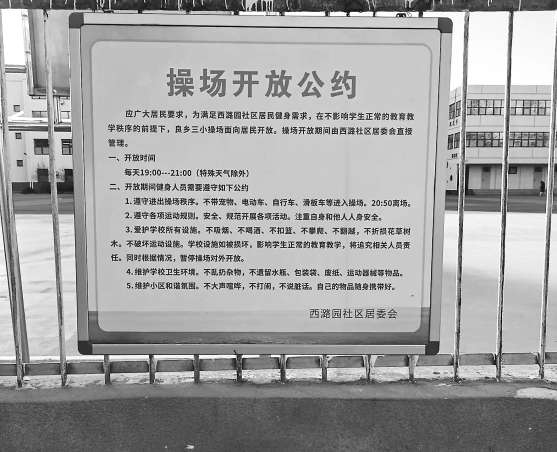 這么多人,如果光靠社區(qū)單方面管理,可能還是會有顧及不到的地方?!拔覀兒途用窆餐套h,制定了一份‘操場開放公約’,全體入內(nèi)活動的居民都有義務(wù)遵守?!?/p>