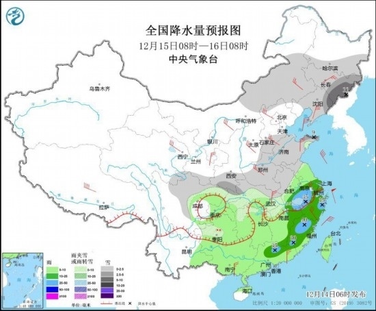 全國降水量預(yù)報圖(12月14日08時-15日08時)。圖片來源:中央氣象臺網(wǎng)站
