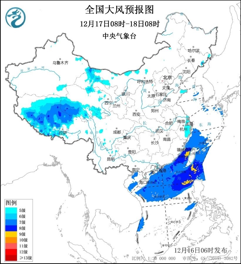 12月17日08時至18日08時,內(nèi)蒙古西北部、西藏中西部、甘肅河西、上海、浙江東部等地有5級、陣風(fēng)6級的大風(fēng),其中,西藏中西部、甘肅河西等地部分地區(qū)有6~7級、陣風(fēng)8級的大風(fēng);東海南部海域、臺灣海峽、臺灣以東洋面、巴士海峽、南海北部和中部海域、北部灣將有7~8級、陣風(fēng)9~10級的大風(fēng),其中臺灣海峽、巴士海峽和南海東北部的部分海域風(fēng)力可達(dá)9級、陣風(fēng)10~11級。