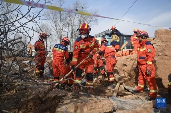12月19日,救援人員在青海省海東市民和回族土族自治縣中川鄉(xiāng)金田村清理地震引發(fā)的砂涌。