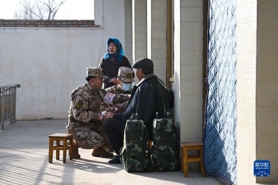 12月19日,武警青海總隊海東支隊衛(wèi)生隊醫(yī)師在青海省海東市民和回族土族自治縣中川鄉(xiāng)草灘村開展醫(yī)療保障。