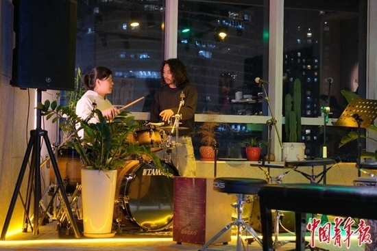 12月4日,北京市朝陽(yáng)區(qū)望京的一處寫字樓里,夜校老師、樂(lè)隊(duì)鼓手老萬(wàn)(右)在為一名學(xué)員講授架子鼓課程,她是一名零基礎(chǔ)學(xué)員。中青報(bào)·中青網(wǎng)見習(xí)記者 田嘉碩/攝