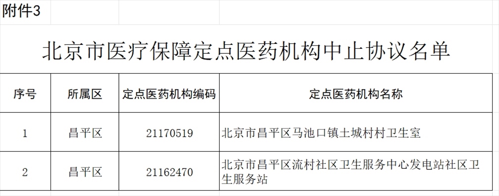 北京市昌平區(qū)馬池口鎮(zhèn)土城村村衛(wèi)生室等2家定點(diǎn)醫(yī)藥機(jī)構(gòu)因不能繼續(xù)為參保人員提供服務(wù),申請(qǐng)中止協(xié)議,經(jīng)市、區(qū)醫(yī)保經(jīng)辦機(jī)構(gòu)審核,現(xiàn)決定對(duì)上述2家定點(diǎn)醫(yī)藥機(jī)構(gòu)中止協(xié)議(見(jiàn)附件3)。