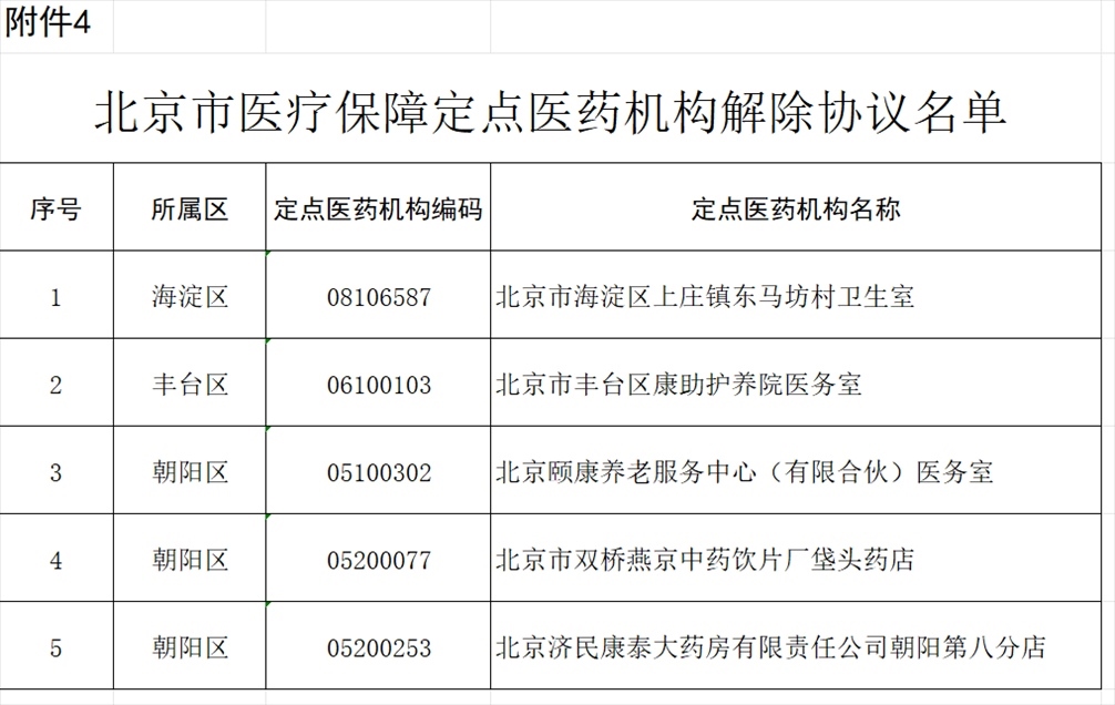 北京市海淀區(qū)上莊鎮(zhèn)東馬坊村衛(wèi)生室等5家定點(diǎn)醫(yī)藥機(jī)構(gòu)因已注銷(xiāo),申請(qǐng)解除協(xié)議。經(jīng)市、區(qū)醫(yī)保經(jīng)辦機(jī)構(gòu)審核,對(duì)上述5家定點(diǎn)醫(yī)藥機(jī)構(gòu)解除協(xié)議(見(jiàn)附件4)。
