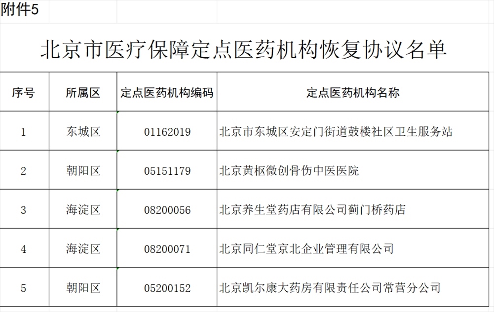 北京市東城區(qū)安定門(mén)街道鼓樓社區(qū)衛(wèi)生服務(wù)站等5家醫(yī)藥機(jī)構(gòu)申請(qǐng)恢復(fù)協(xié)議,經(jīng)市、區(qū)醫(yī)保經(jīng)辦機(jī)構(gòu)審核,上述5家醫(yī)藥機(jī)構(gòu)已經(jīng)具備承擔(dān)醫(yī)療保障任務(wù)的條件,現(xiàn)決定對(duì)上述5家醫(yī)藥機(jī)構(gòu)恢復(fù)協(xié)議(見(jiàn)附件5)。