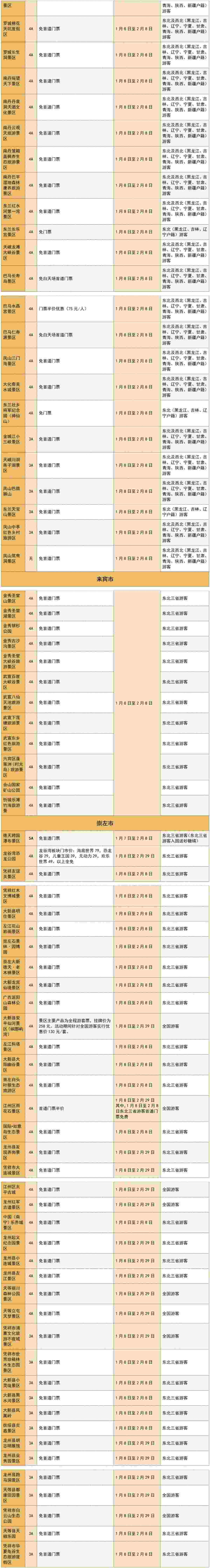 柳州程陽八寨景區(qū)、桂林桂海晴嵐、百色靖西通靈大峽谷景區(qū)、百色樂業(yè)大石圍天坑群景區(qū)、賀州黃姚古鎮(zhèn)景區(qū)、河池羅城棉花天坑度假區(qū)、崇左德天跨國瀑布景區(qū)、崇左大新縣明仕景區(qū)、崇左左江花山巖畫景區(qū)等等,近兩百家廣西景區(qū)面向東北“老鐵”推出免門票或打折優(yōu)惠政策!此外,還有多家景區(qū)面向全國游客推出優(yōu)惠政策!