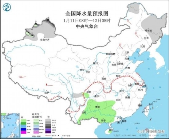 1月11日08時至12日08時,內蒙古東北部、黑龍江大部、吉林東部、新疆北部、川西高原南部等地部分地區(qū)有小到中雪或雨夾雪,其中,新疆北部塔城、阿勒泰地區(qū)和伊犁河谷等地局地有大到暴雪(10~18毫米)。貴州中南部、云南東部、廣西、湖南西南部、海南島中部等地部分地區(qū)有小雨。內蒙古中東部、河北北部等地部分地區(qū)有5~6級風;黃海中北部、臺灣海峽、巴士海峽、南海東北部和西南部等海域有6~7級風、陣風8級。