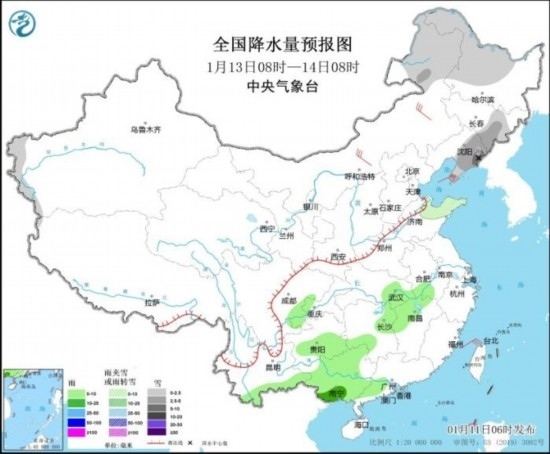 全國降水量預(yù)報圖(1月13日08時-14日08時)