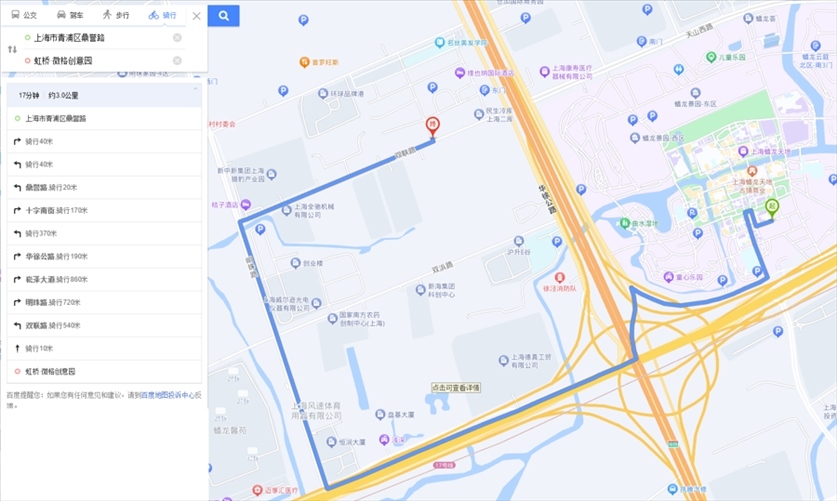 “途經滬青平公路時,平臺也愛規(guī)劃逆行路線?!标愱栮柼峁┑牡?條逆行路線正屬于這一情況。這是從京華路187弄送往南山雨果小區(qū)的一單,平臺規(guī)劃的路線中,指示騎手從明珠路右拐進入滬青平公路向西騎行至葉聯路再向南。可是,滬青平公路在葉聯路路口處沒有過街橫道線,此時,平臺索性規(guī)劃騎手沿著滬青平公路南側逆向騎行。1月8日,記者實地走了一遍這段路線:若騎手沿著滬青平公路北側騎行,需一直向西騎到徐盈路才能過街,再沿著滬青平公路南側向東抵達葉聯路。手機顯示,繞行路線比美團平臺規(guī)劃路線遠了1.2公里。