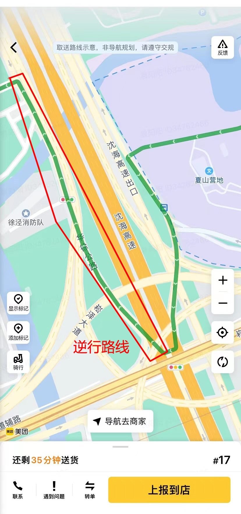 這樣的逆行路線多嗎?1月6日上午,記者守在京華路187弄小商品市場。9時許,午餐送餐高峰即將開始,大量騎手聚集在弄內,坐在電動自行車上刷手機搶單。記者詢問了多名美團騎手,他們均反饋稱附近滬青平公路、北青公路、崧澤高架路輔道、沈海高速輔道縱橫,遇到平臺規(guī)劃逆行路線的情況比比皆是。一名美團騎手稱他曾做過統(tǒng)計,前兩天的中午他送了17單,其中有5單均遇到了逆行路線。上午10時一過,騎手的手機開始叮當響起。陳陽陽接連搶到了兩單,他點開軟件界面向記者展示,竟均包含了逆行的路線……