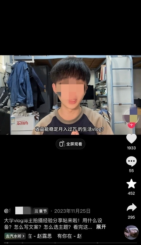 2023年11月25日,一名自稱大學(xué)生的短視頻博主向大學(xué)生網(wǎng)友分享自己如何零基礎(chǔ)拍攝Vlog穩(wěn)定收益月入過(guò)萬(wàn)元。