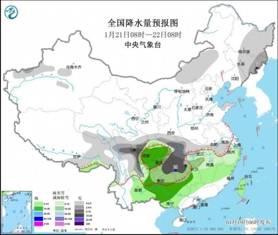 1月21日08時至22日08時,內(nèi)蒙古中部、東北地區(qū)中東部、新疆南疆盆地西部、西藏南部和東部、青海南部、川西高原、陜甘南部、湖北大部、安徽南部、浙江大部、江西北部、湖南中北部、貴州大部等地部分地區(qū)有小到中雪或雨夾雪,其中,川西高原東部、湖北西南部、湖南西北部、重慶東部、貴州東北部等地部分地區(qū)有大到暴雪,局地大暴雪(20~25毫米)。江南中南部、西南地區(qū)東部和南部、華南北部和西部、臺灣島等地部分地區(qū)有小到中雨。內(nèi)蒙古中東部、東北地區(qū)西部部分地區(qū)有4~5級風(fēng)。渤海、黃海大部、東海大部、臺灣海峽、南海北部和西南部海域?qū)⑾群笥?~7級、陣風(fēng)8級的東北到偏北風(fēng)(見圖3)。
