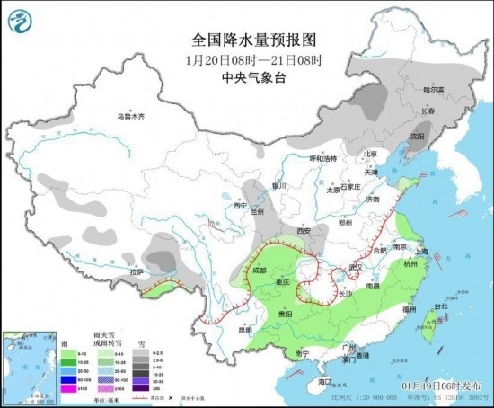 圖1 全國降水量預(yù)報圖(1月19日08時-20日08時)