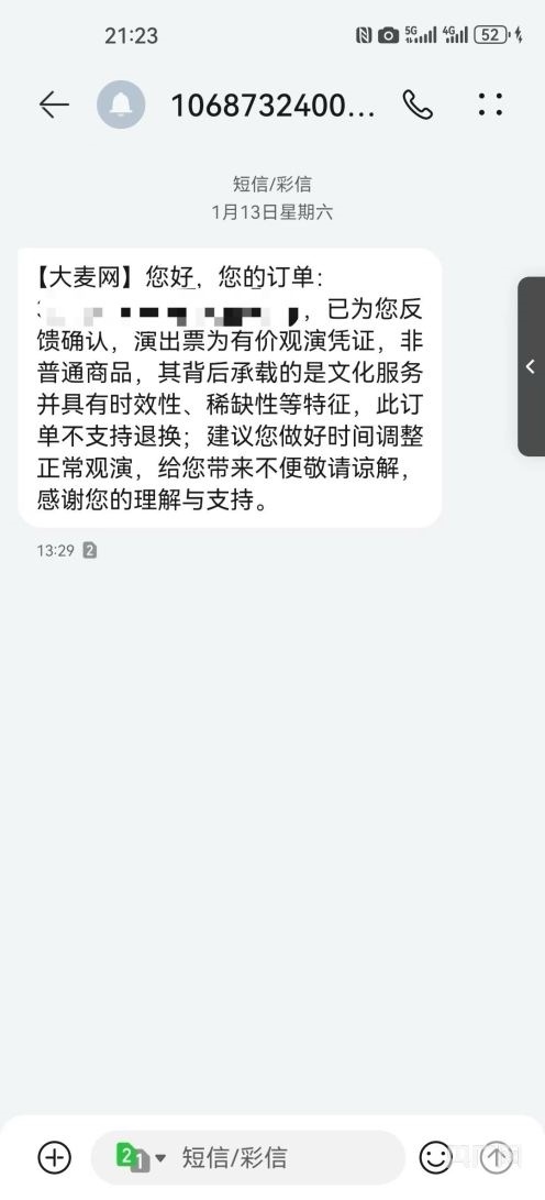 周女士說自己第一時(shí)間就通過多個(gè)渠道嘗試退票,但都沒有成功。“人工客服的工作時(shí)間是早上9點(diǎn)到晚上8點(diǎn),我打電話的時(shí)候不在他們工作時(shí)間范圍內(nèi)。當(dāng)時(shí)也確實(shí)聯(lián)系不到其他渠道,于是我就在12315,包括黑貓投訴進(jìn)行退票退款的申請。13號早上9點(diǎn),大麥客服說此訂單不支持退換,13號下午1點(diǎn)半的時(shí)候,給了我一個(gè)反饋短信,說是已為我反饋確認(rèn),演出票為有價(jià)觀影憑證非普通商品,其背后承載的是文化服務(wù),并具有時(shí)效性、稀缺性等特征,此訂單不支持退換,然后就建議我做好時(shí)間調(diào)整正常觀演?!?/p>