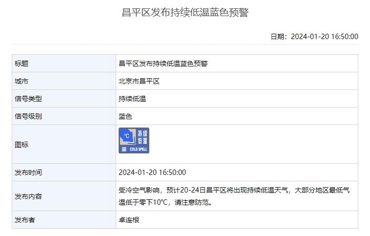 1月20日,北京延慶、懷柔、昌平3區(qū)發(fā)布持續(xù)低溫藍(lán)色預(yù)警。受冷空氣影響,預(yù)計20—24日這3個區(qū)將出現(xiàn)持續(xù)低溫天氣,其中延慶、懷柔兩地大部分地區(qū)氣溫低于零下15℃,請注意防范。