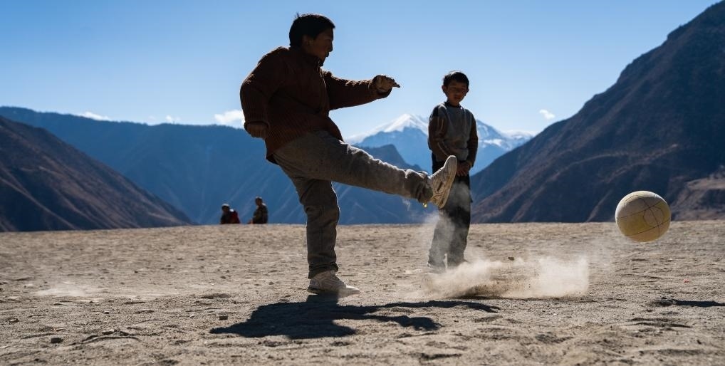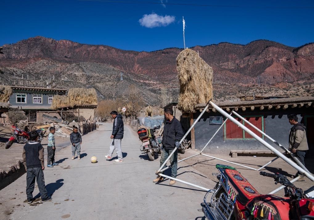 等待焊接的一會(huì)兒工夫,村里的孩子們也要跑來和嘎瑪群美踢兩腳
